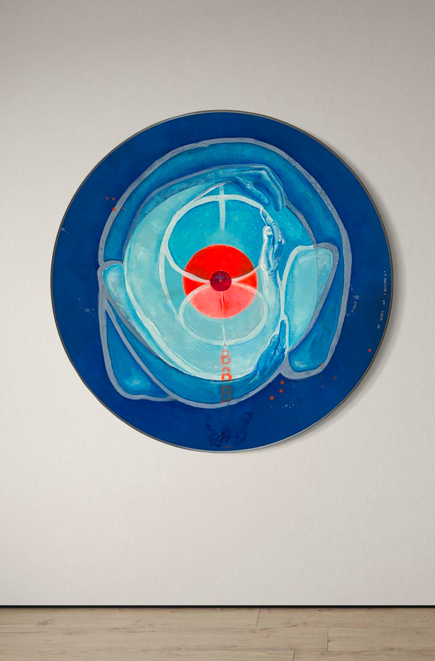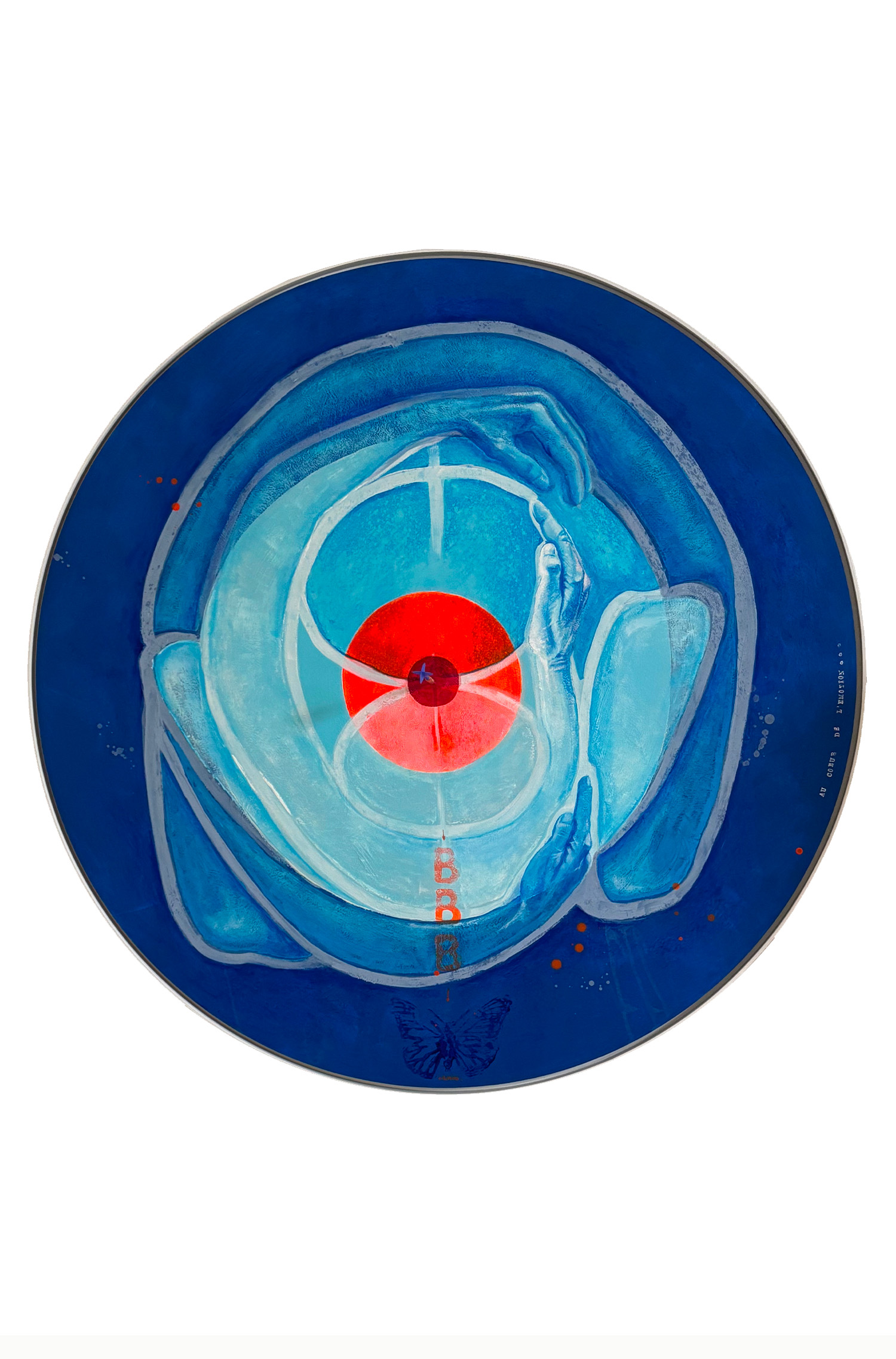 Cette œuvre circulaire, construite comme une cible, explore la rencontre entre deux êtres. Au centre, deux silhouettes se frôlent avec tendresse leurs têtes se touchent dans un geste de douceur et de bienveillance.