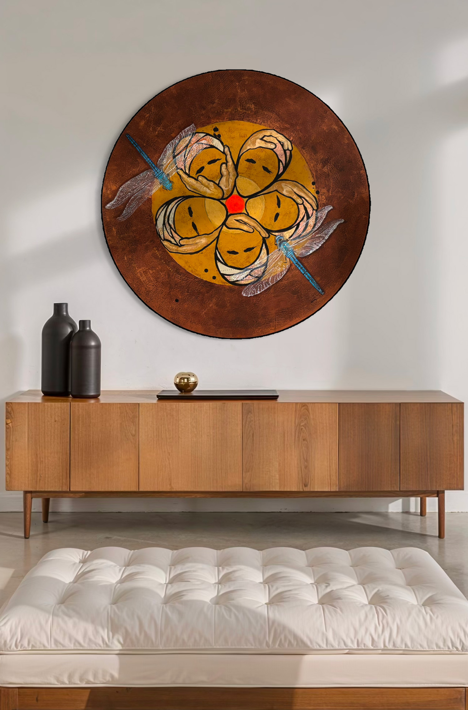« Circle of Life », représente une série de visages humains disposés en cercle, entourés et soutenus par des mains protectrices. Les libellules gravitent et veillent, incarnant la nature, sa fragilité mais aussi sa capacité de transformation. Leur présence rappelle que la protection de l’humanité est indissociable de celle du vivant.