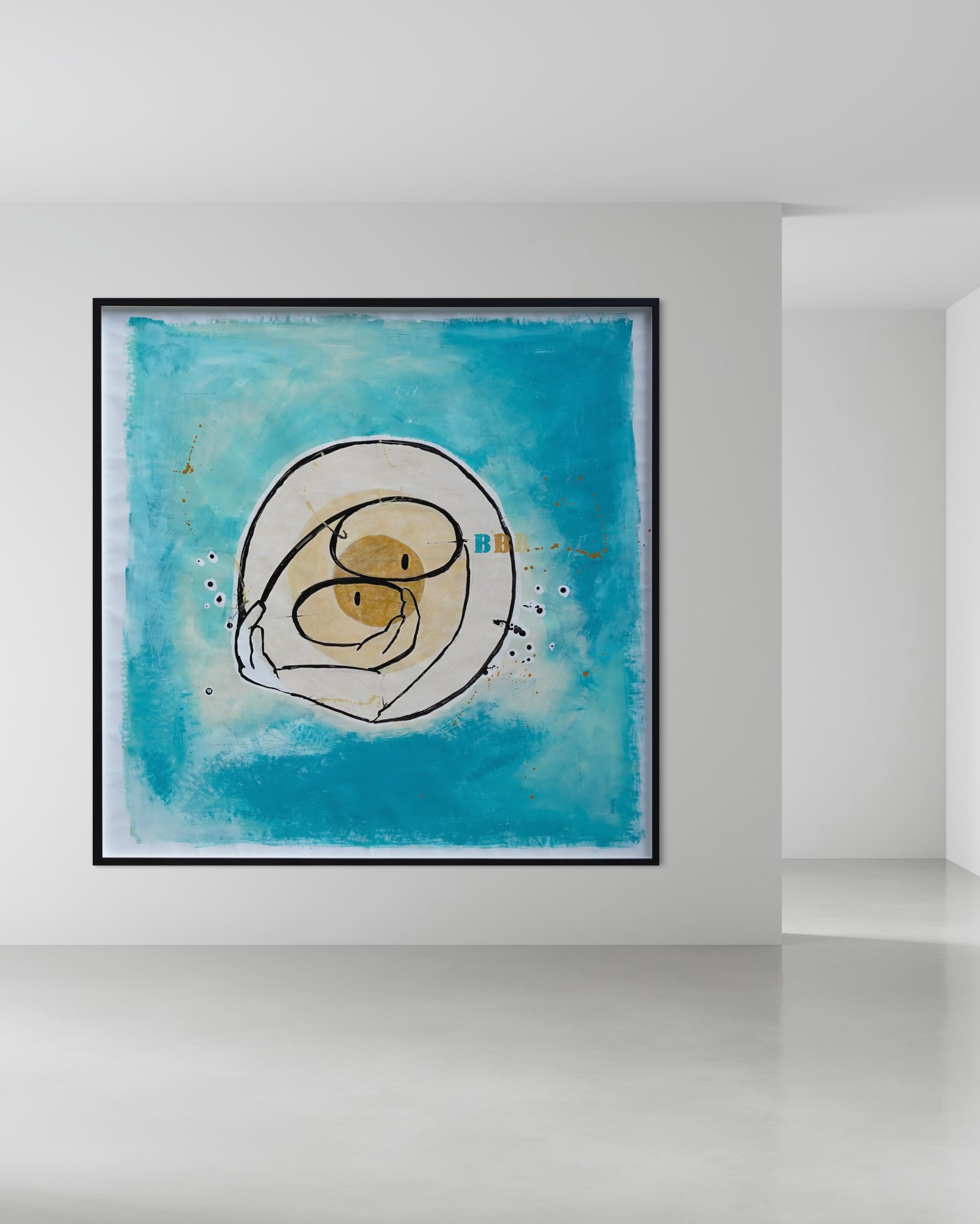 Au centre de la toile, deux êtres vus du dessus s’entrelacent, formant un cercle intime et protecteur.