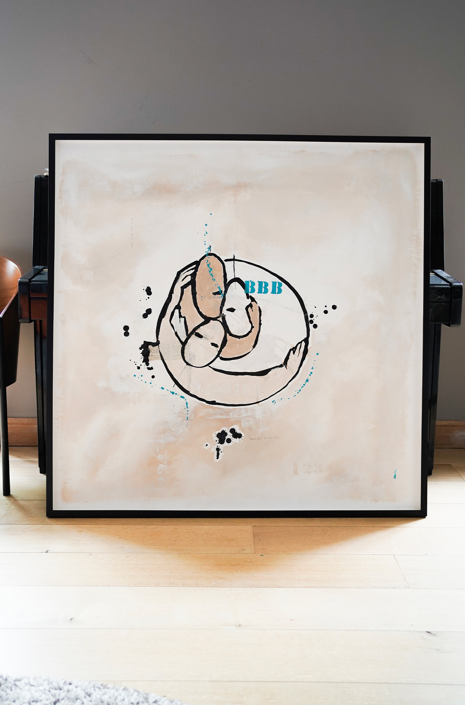 On y voit une composition circulaire où plusieurs figures stylisées, aux formes organiques et épurées, s’entrelacent dans une douce étreinte.