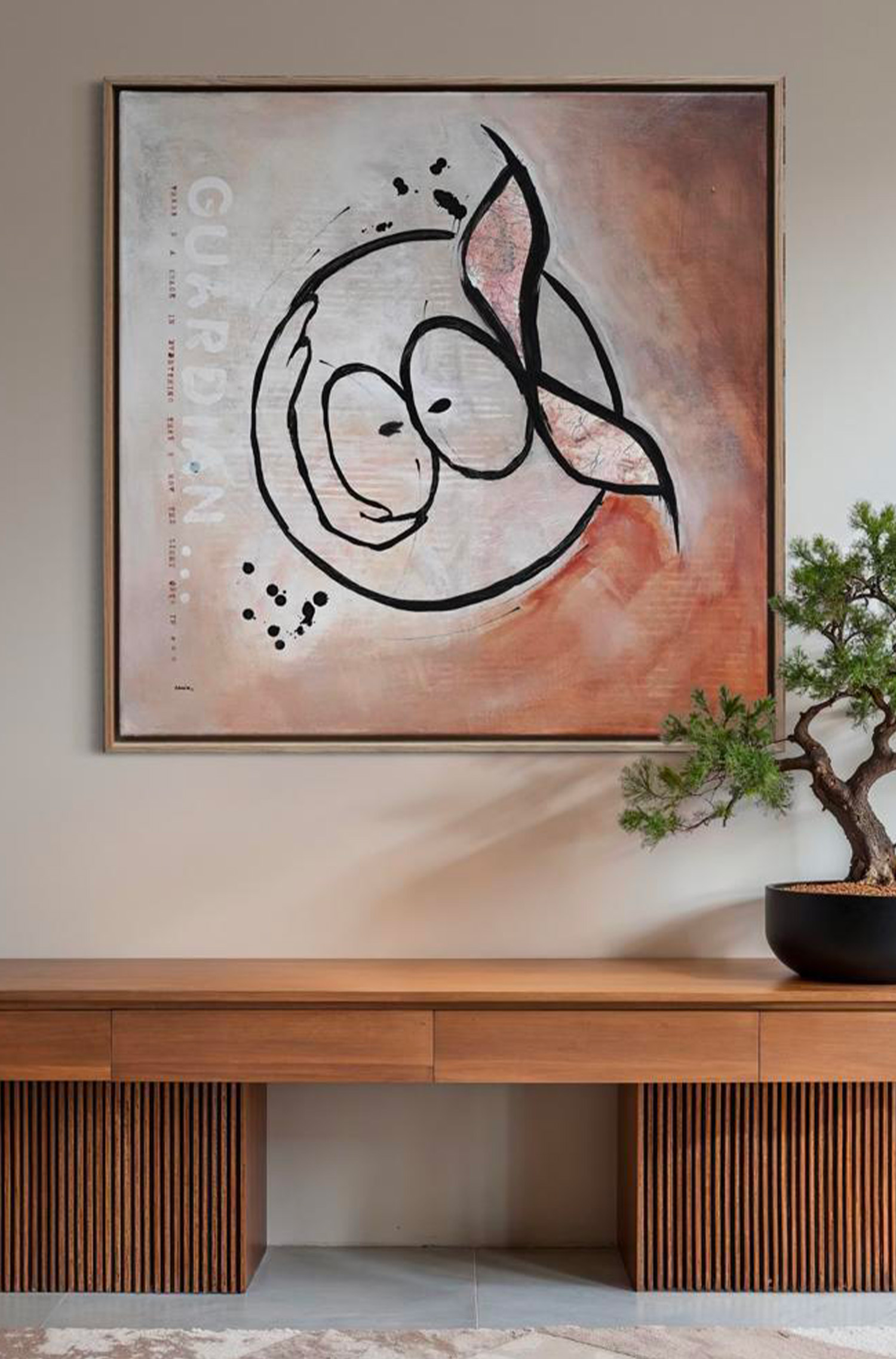 Le tableau représente deux personnages : un humain et un ange qui l’entoure de ses bras protecteurs, identifiable grâce à ses ailes. En dessous figure la citation de Leonard Cohen : “There’s a crack in everything, that’s how the light getsin”. L’ensemble associe l’idée de protection à celle de vulnérabilité, en soulignant que la lumière et la force peuvent émerger à travers les imperfections.
